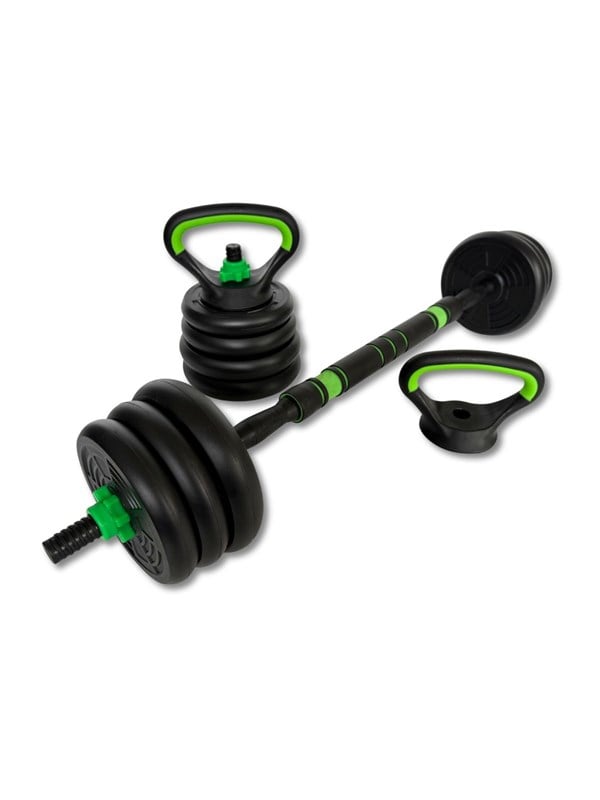 Justerbart alt-i-én træningssæt – 20 kgKan anvendes som håndvægte, vægtstang eller kettlebell19 kg vægtskiver i forskellige vægtklasser2 x 43 cm håndvægtsstænger + 40 cm samlestangKettlebell- og push-up-greb inkluderetOpgrader din hjemmetræning med ASG 20
