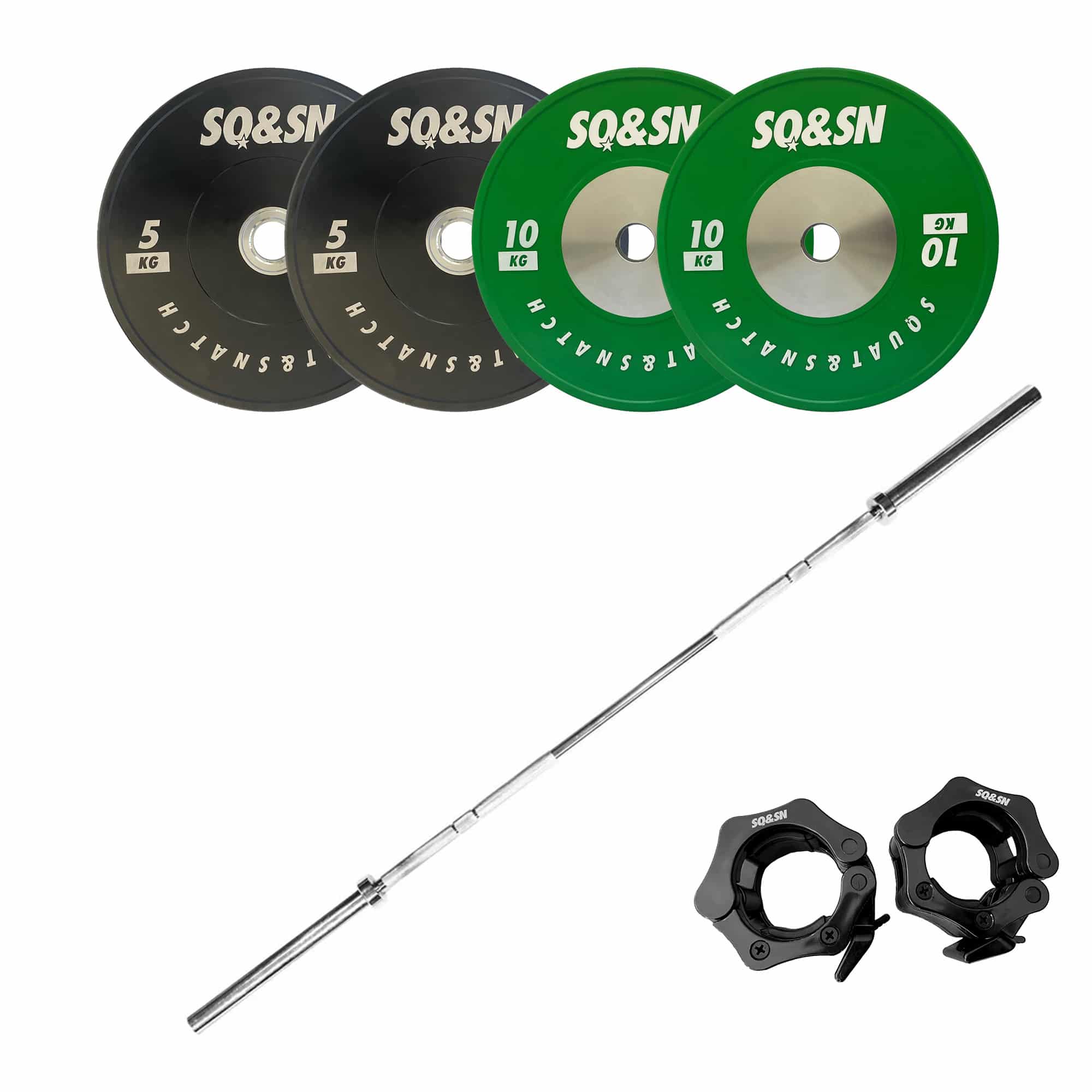 Komplet vægtstangssæt bestående af en SQ&SN OL Vægtstang (20 kg), et sæt SQ&SN Lock Jaw (50 mm) samt et sæt SQ&SN Competition Bumper Plates.